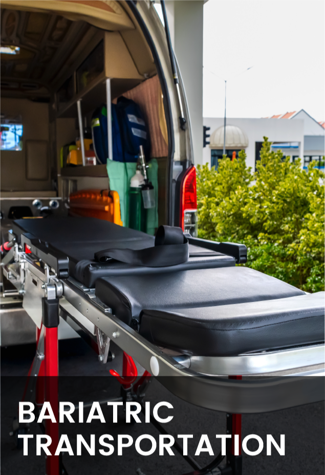 Our fleet includes ADA-compliant vehicles designed for bariatric transport, featuring:• Reinforced Stretchers and Wheelchairs: Safely accommodating patients 300+ pounds