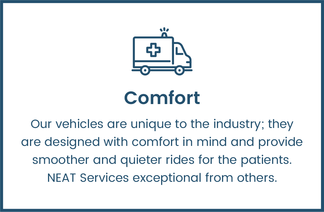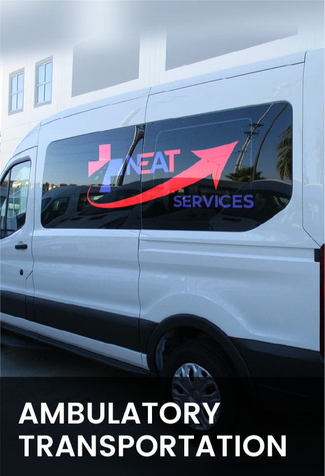 NEAT Transportation Services provides trusted non-emergency medical transportation (NEMT) in the Inland Empire, ensuring safe, reliable, and timely transport for patients. We specialize in senior medical transportation, wheelchair-accessible transportation, and compassionate medical rides across Riverside County and surrounding areas.Our offerings include Basic Life Support (BLS), wheelchair transportation, and medical taxi services. As a leading non-emergency ambulance provider, we serve Hemet, Murrieta, Redlands, and beyond with ADA-compliant medical transport vehicles and professional, compassionate care. Whether you require hospital discharge transportation, dialysis transportation, or long-distance NEMT services, NEAT is here to provide dependable and respectful patient transport.